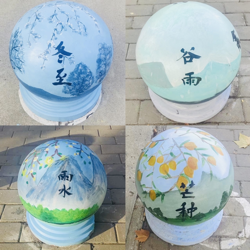本次障碍球创意绘画的内容以传统二十四节气为主,障碍球上涂绘着特定节气的自然景色并书写着相应的节气名称。在装饰教研室老师的带领下,同学们有序分工、相互配合,让画上二十四节气的路边障碍球成为校园一道亮丽的风景线。